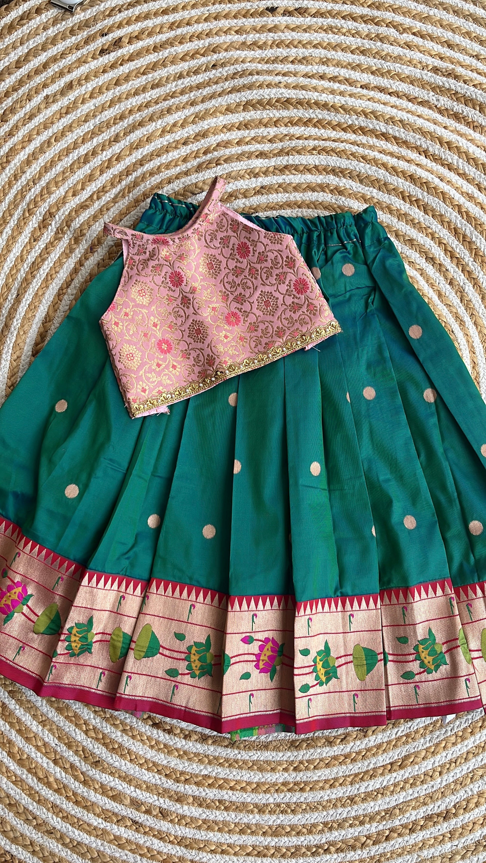 - Colour: Peacock green skirt paired with a light pink blouse